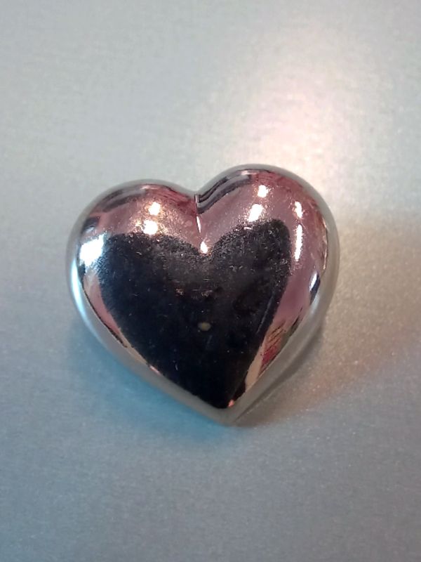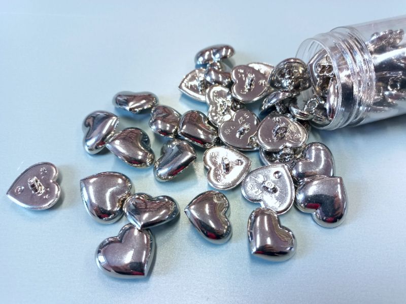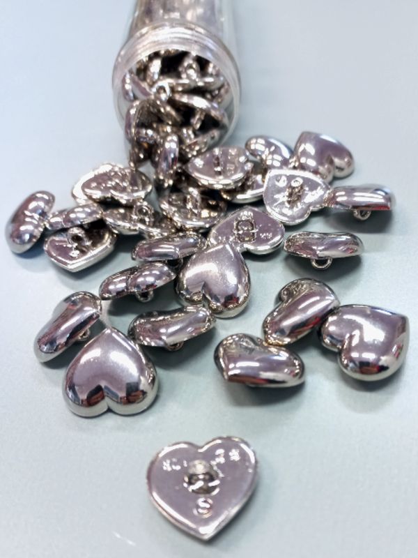 Ezüst színű, szív alakú ,műanyag füles gomb.
