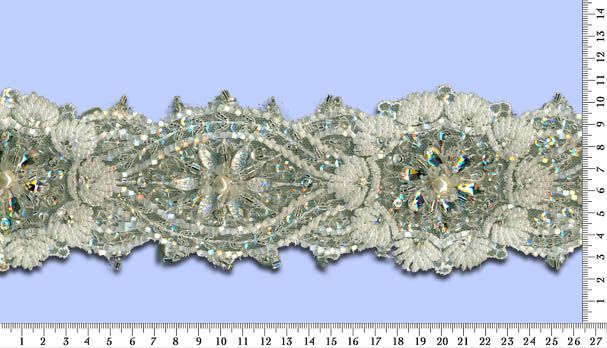 Fehér, fehér tüll alapra hímzett szegő csipke, gyöngyökkel, kristályokkal. 8cm széles.