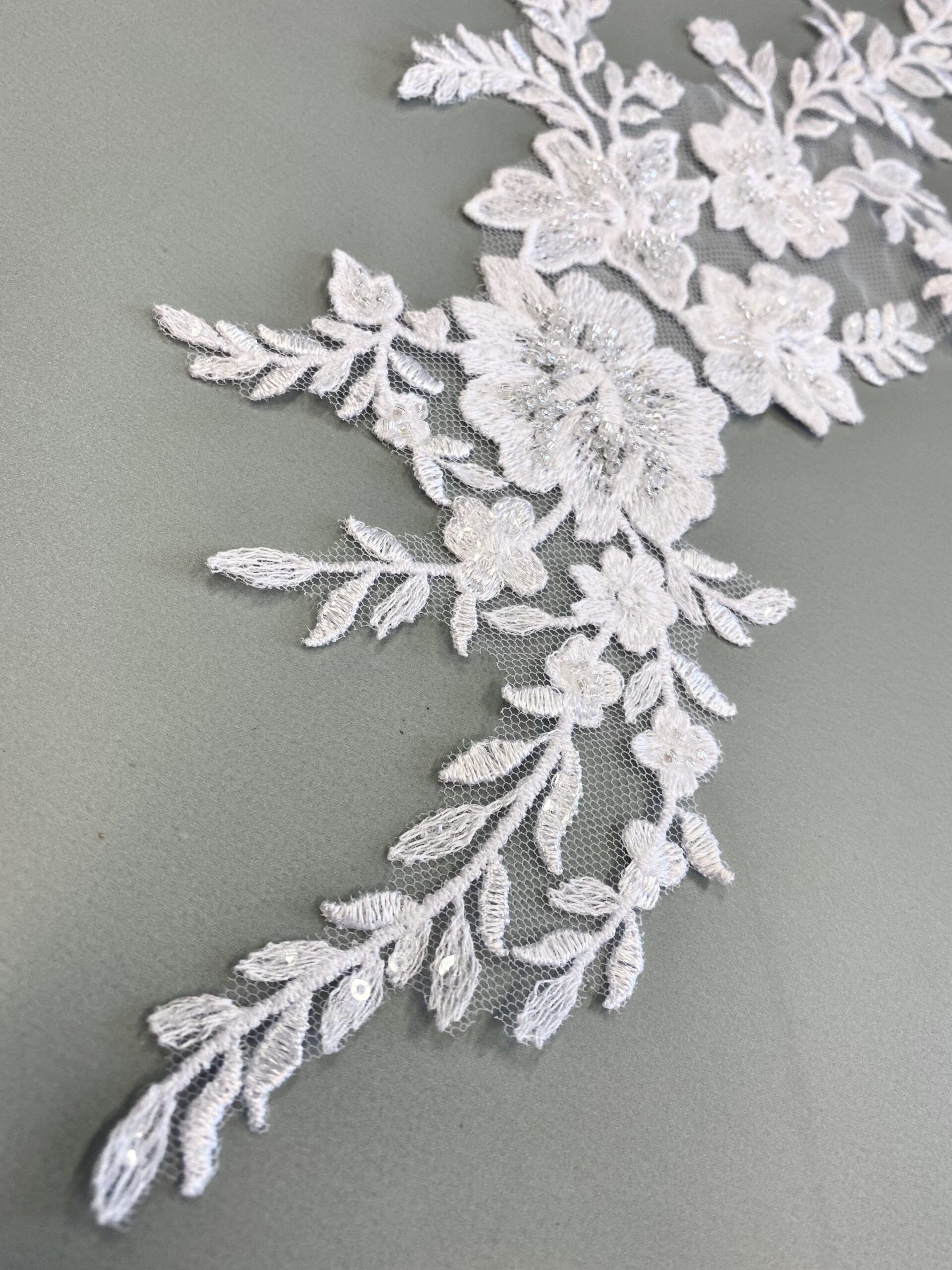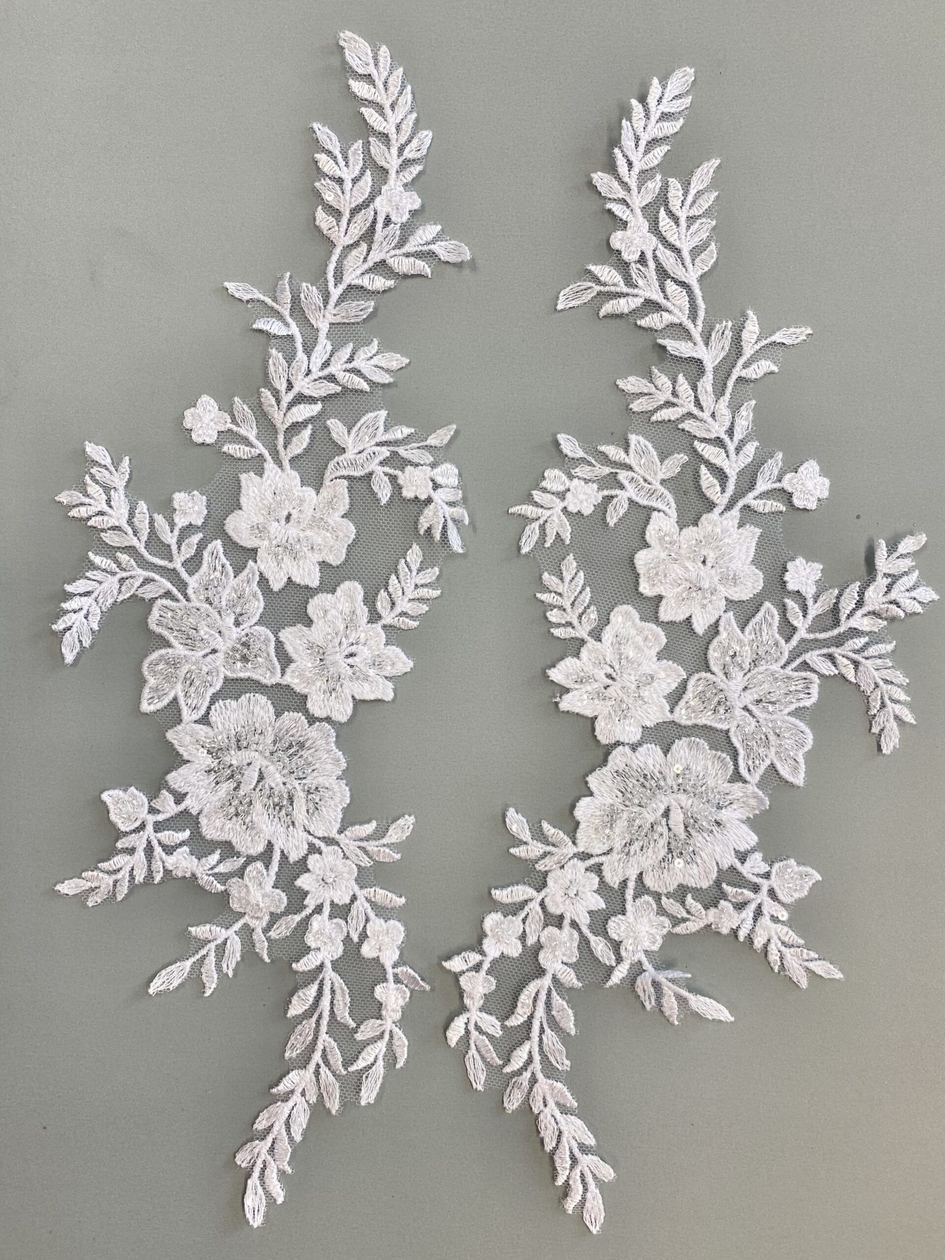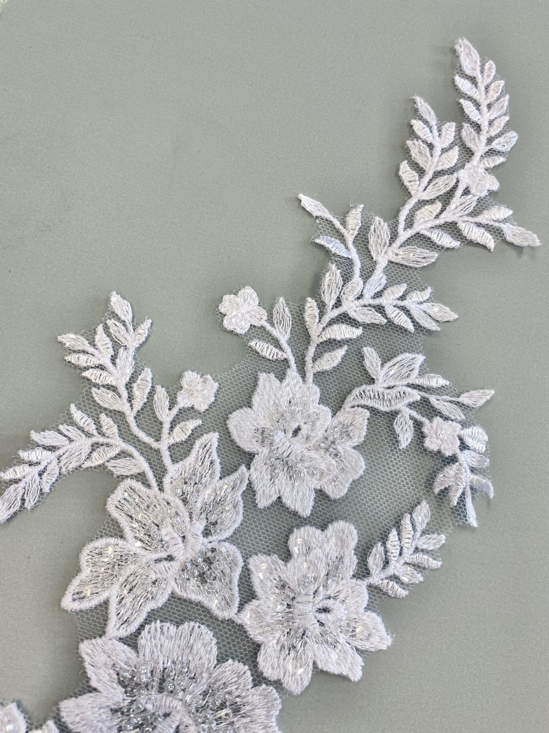 Fehér színű virágos-leveles gyöngyös és flitteres páros csipke. Tüll alapra hímezve.
