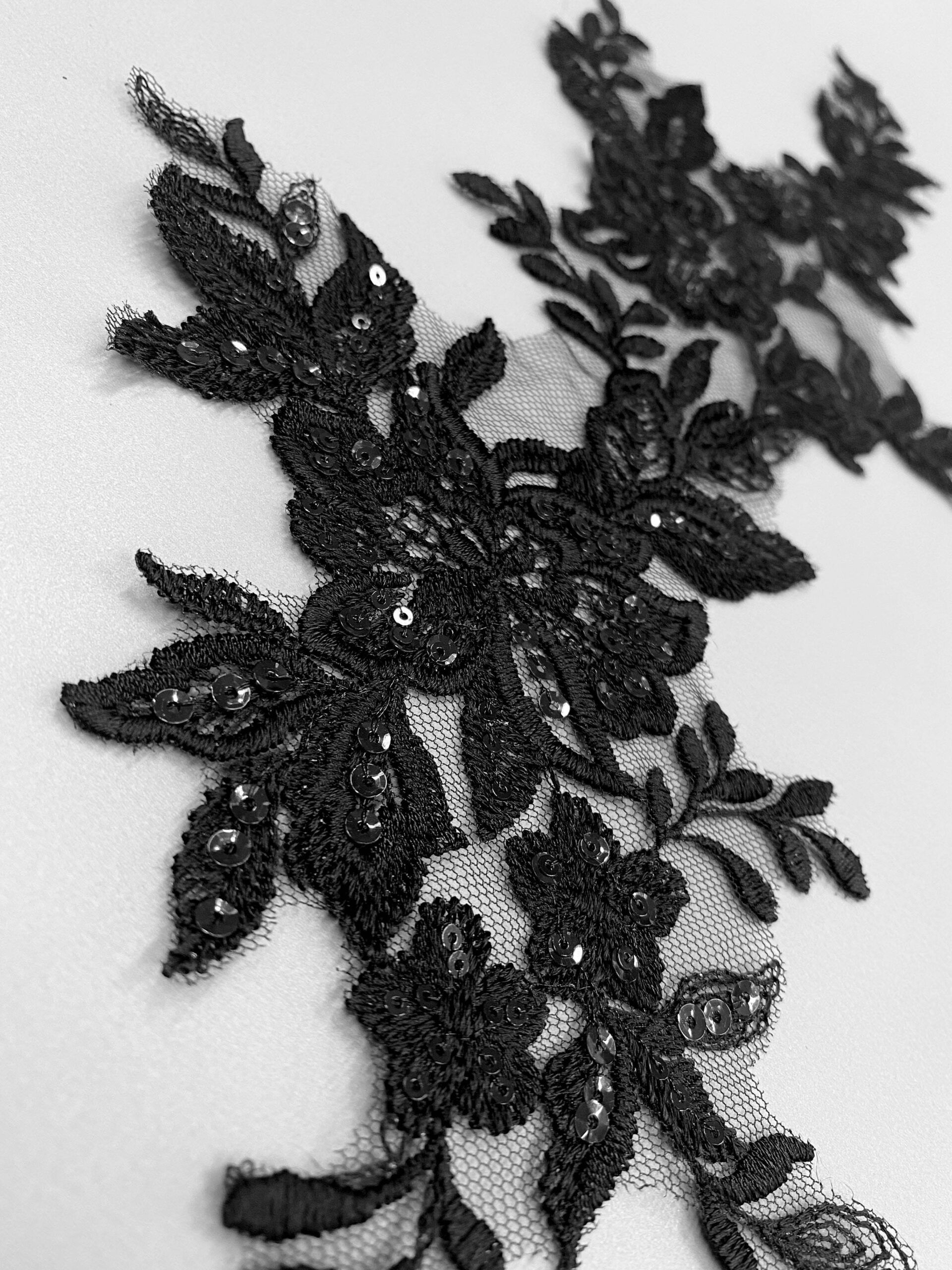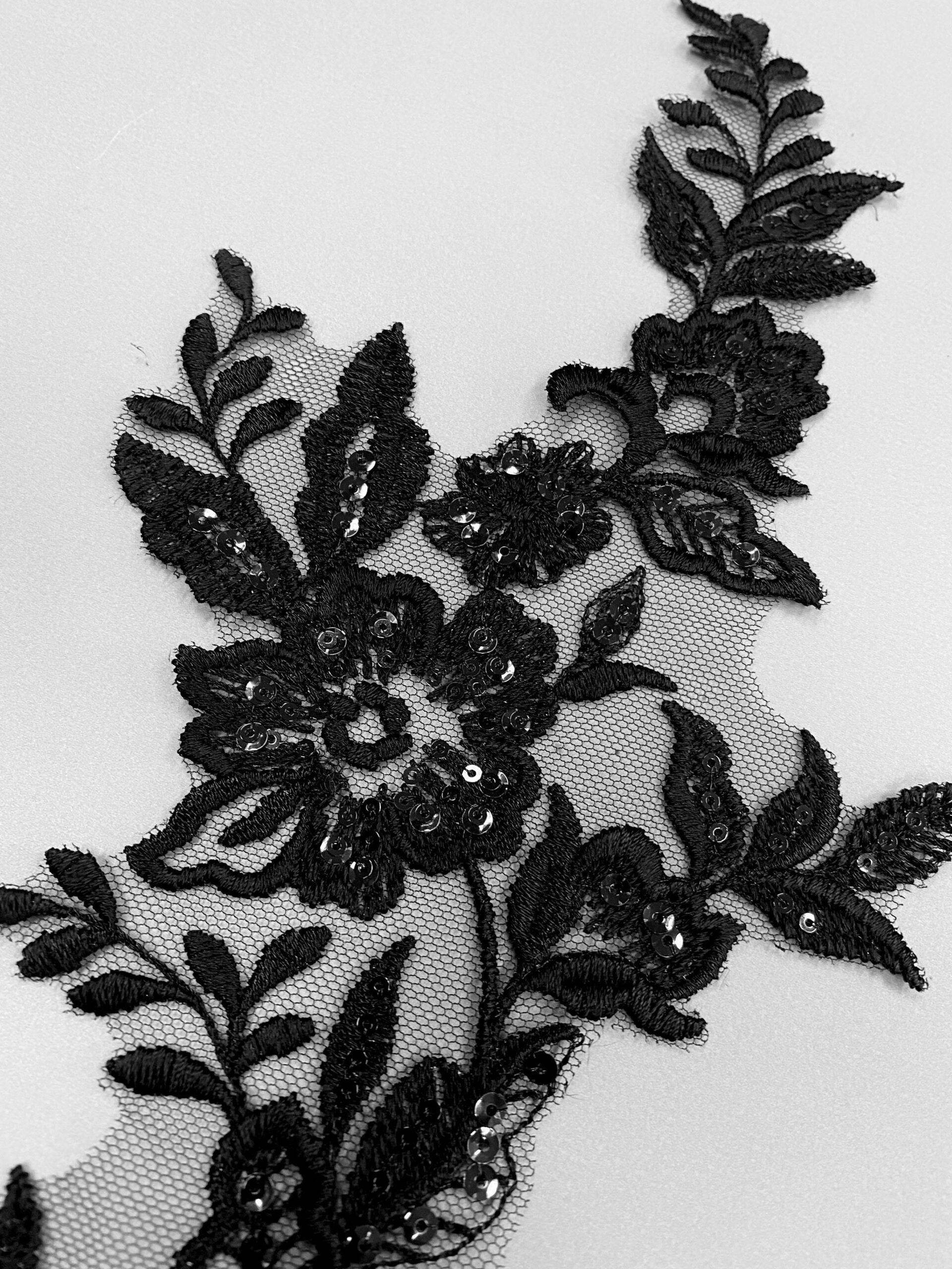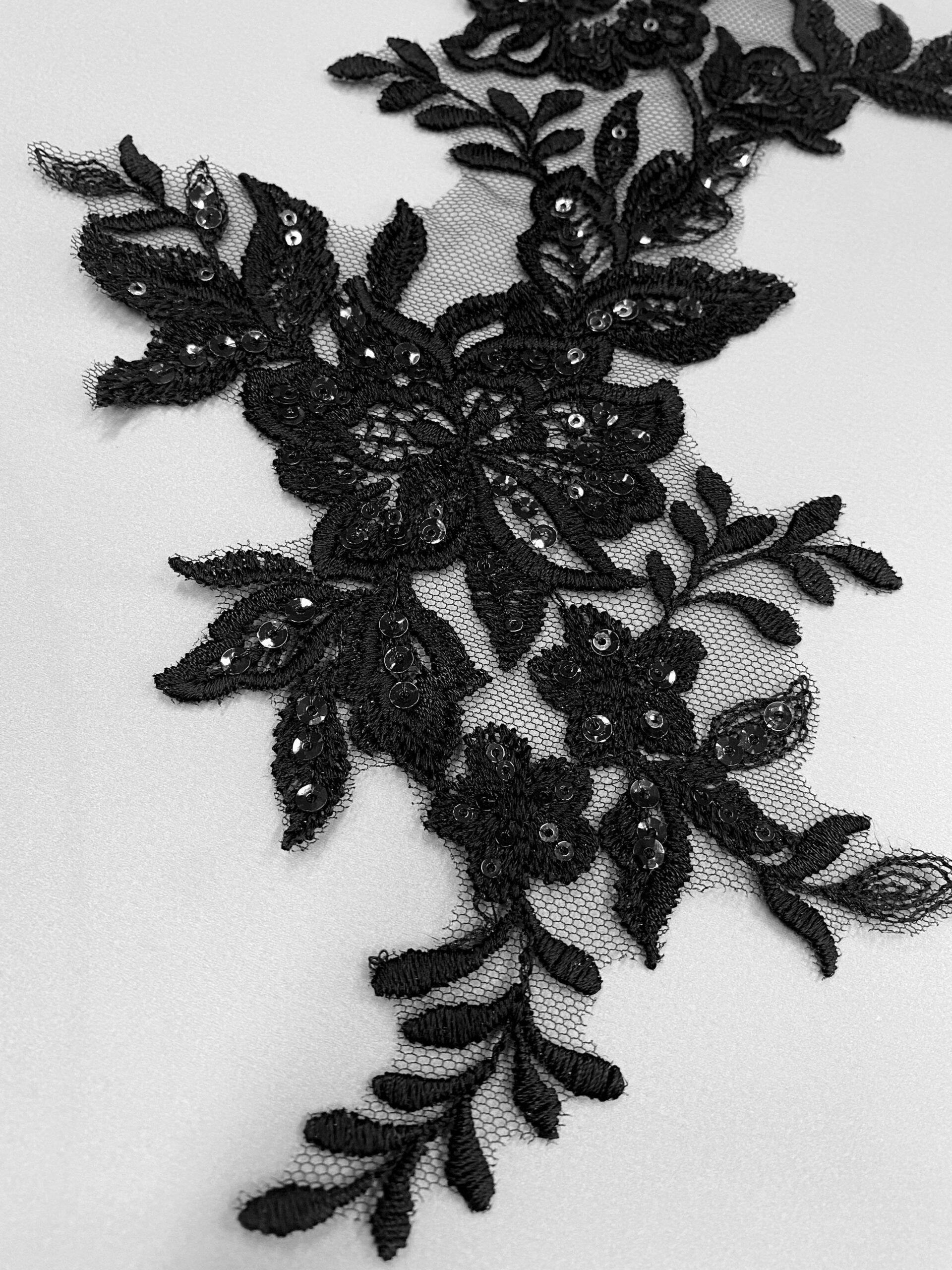 Fekete színű, tüll alapra hímzett páros csipke. Átlátszó flitterekkel díszítve.