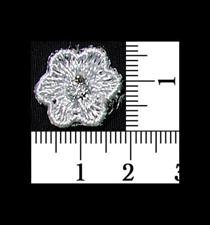 Fehér színű légcsipke virág, közepén ezüst színű hímzéssel. Átmérő: 1,5cm