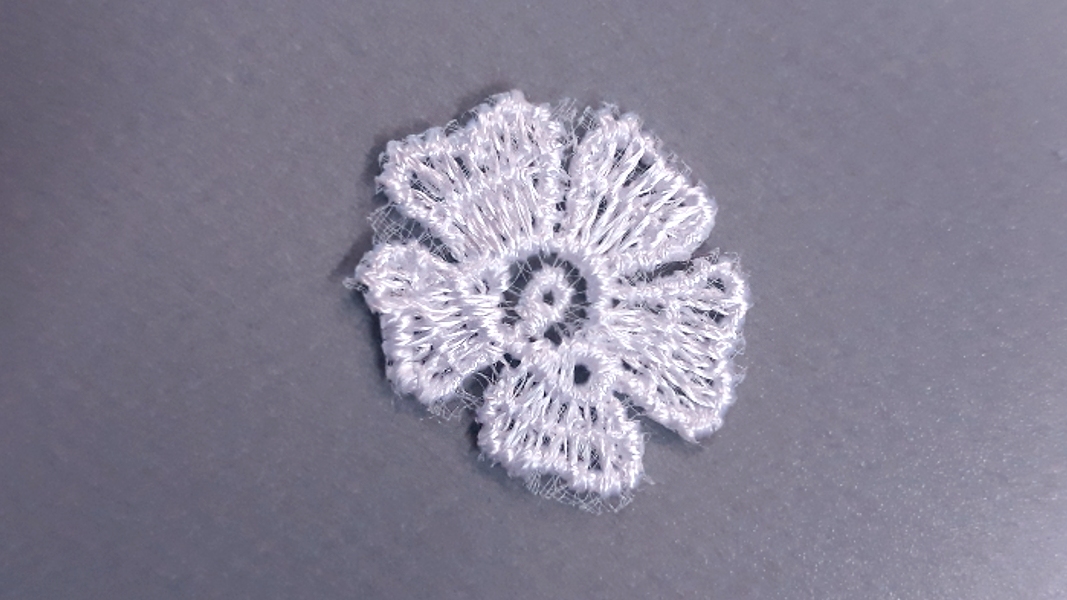 Fehér színű organza alapú csipke virág. Átmérő: 2 cm