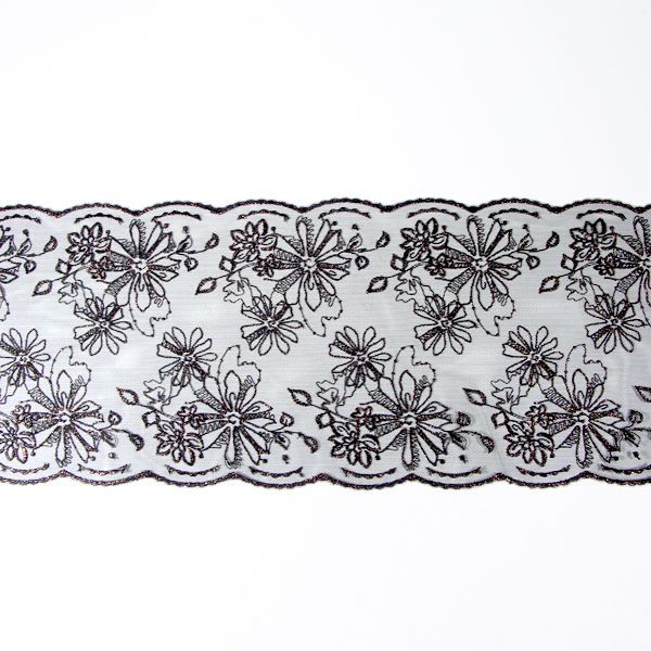 Fekete színű tüll alapú, fényes, bronzos szállal hímzett csipke szegő. 18cm széles