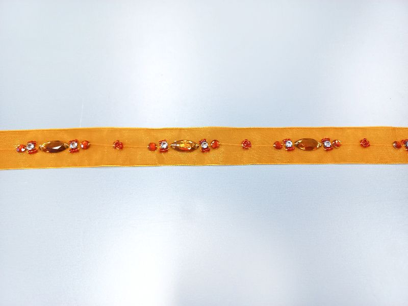 Narancssárga színű ruhadíszítő műanyag gyöngyös organzaszalag, egy színoldalú.