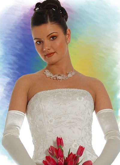 Krém ,,A” vonalú menyasszonyi ruha, felső részén finom gyöngy díszítés. Hátulján zipzáras. Egy részes.