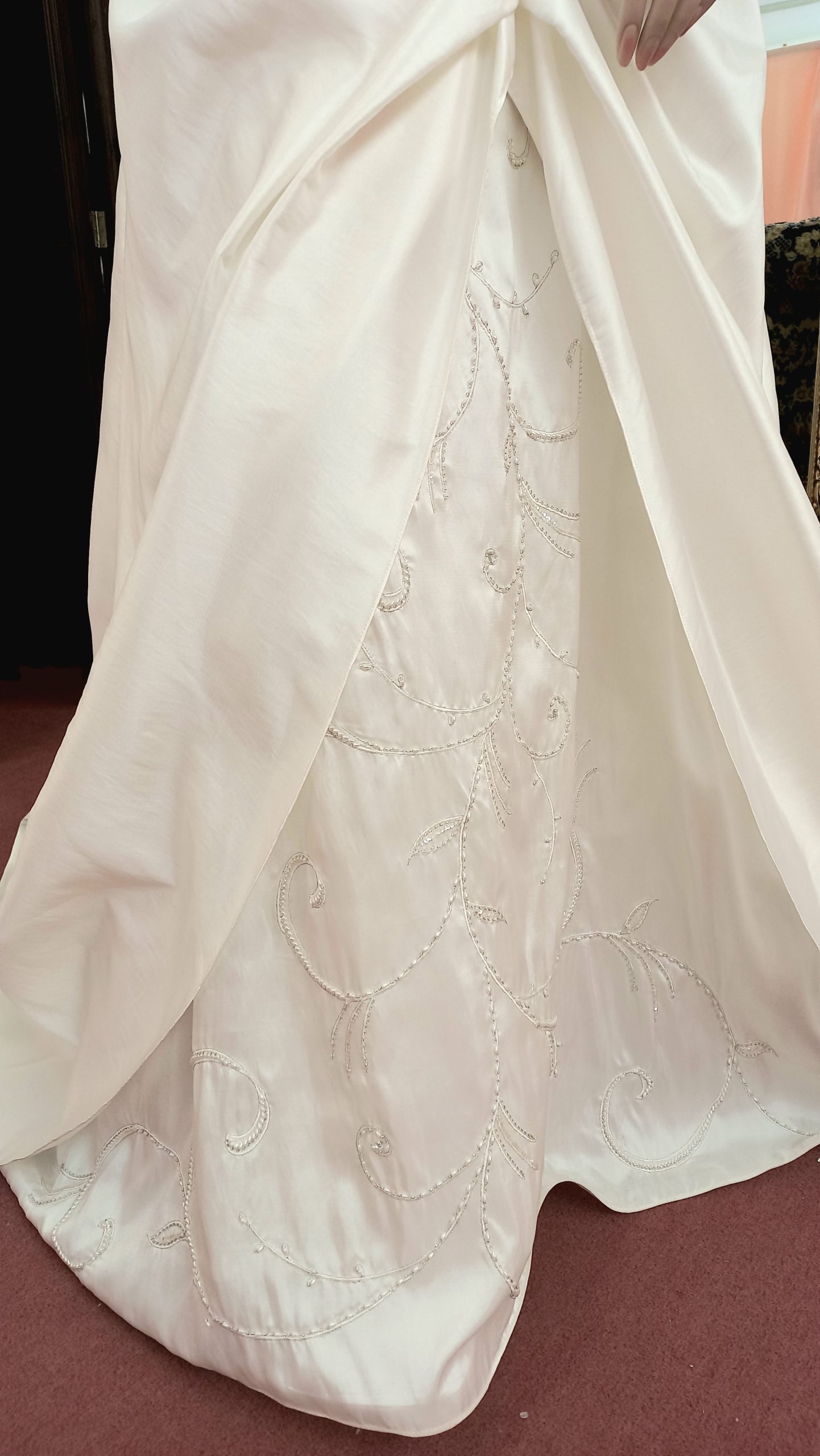 Törtfehér ,,A” vonalú menyasszonyi ruha, felső részén törtfehér gyöngyökkel és ezüst szálas hímzéssel díszítve. Hátulján cipzáras. Egy részes.