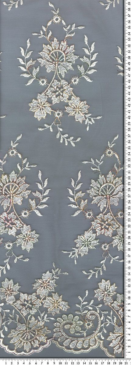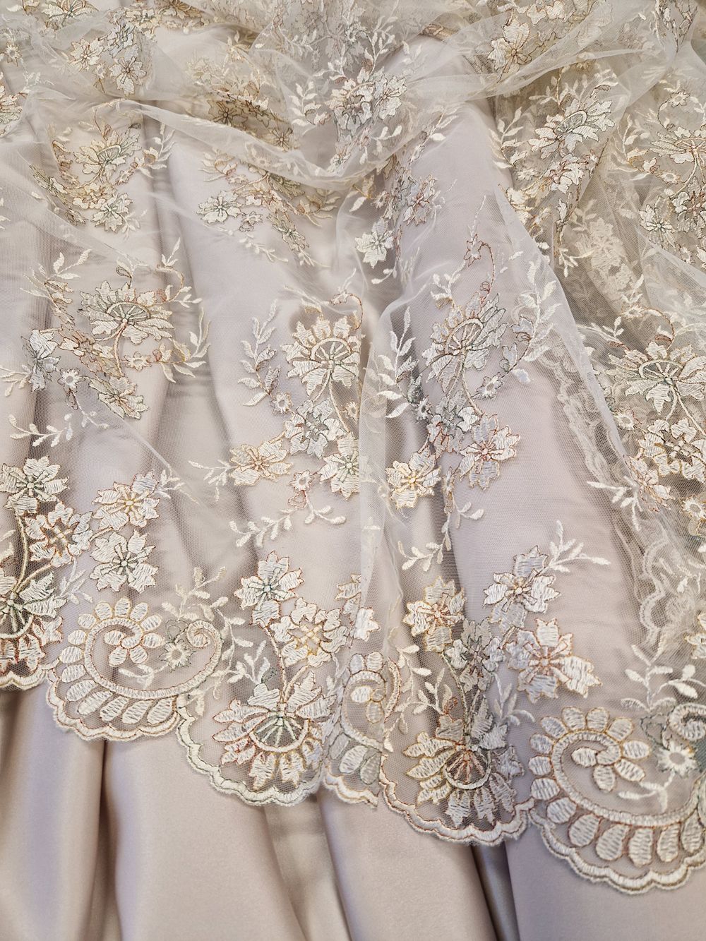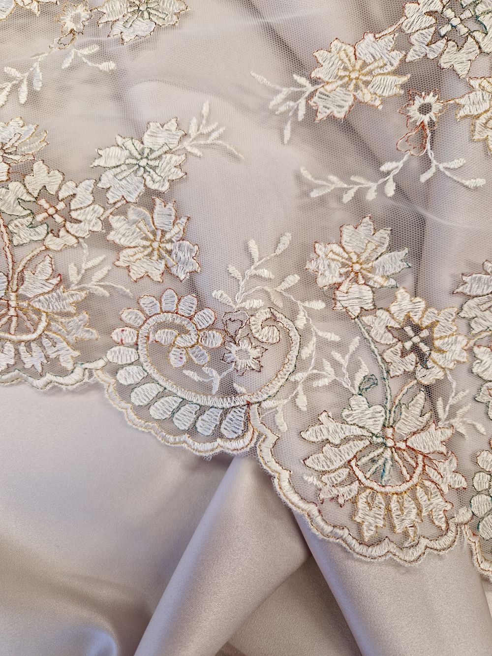 28-554 Sötét krém tüll csipkeanyag, , színes szállal hímzett. Szélessége: 130 cm. Mindkét oldalán bordűrös. Alkalmi és örömanya ruhákhoz.